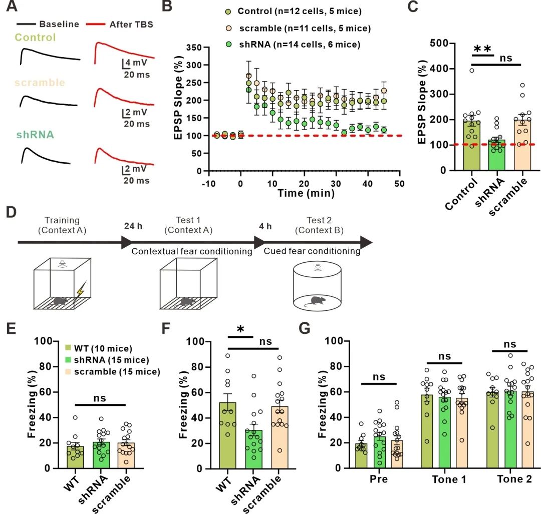 图3.敲除中间神经元γCaMKII导致星胶依赖的LTPE→I和场景恐惧性记忆受损