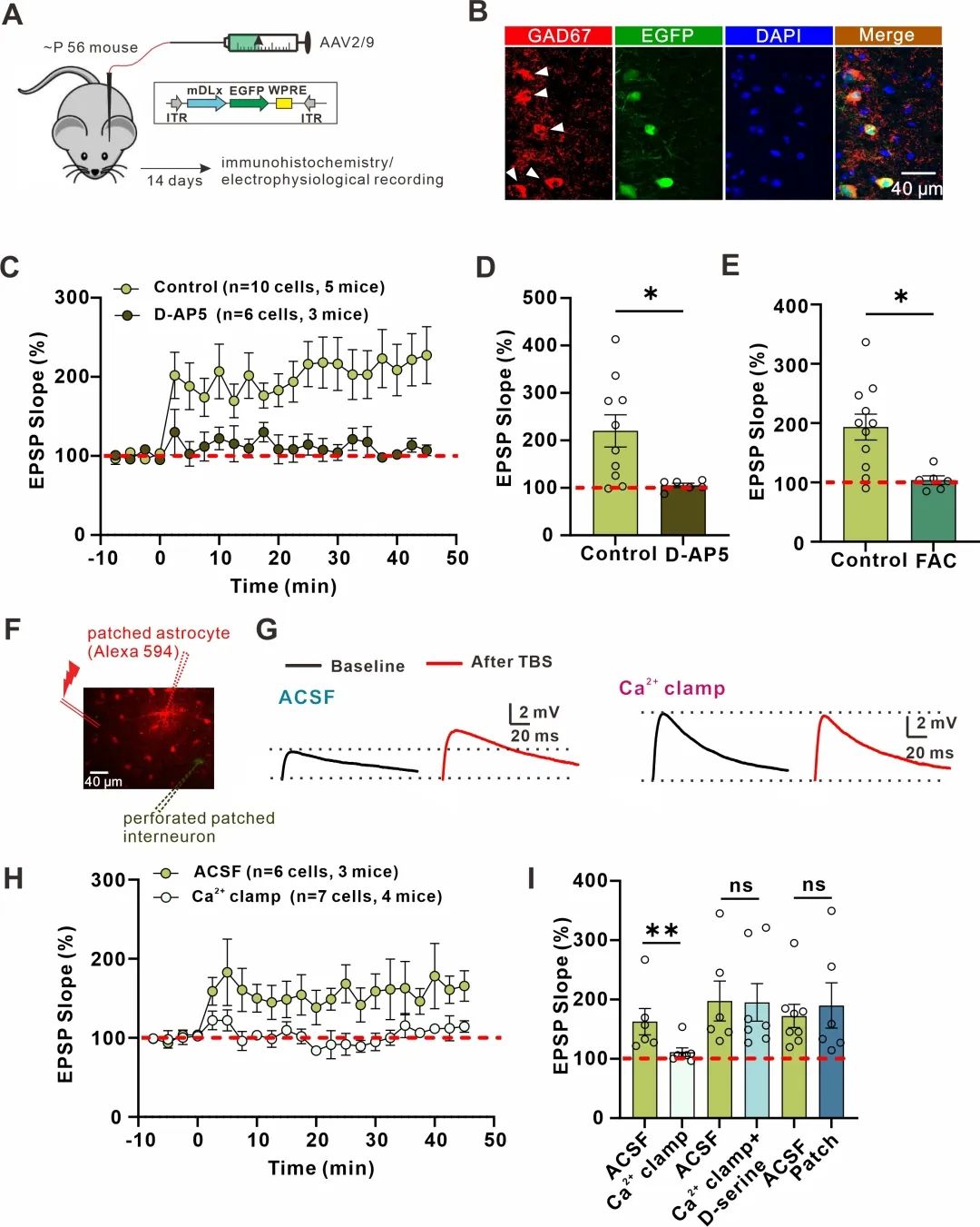 通过脑立体定位注射病毒、穿孔膜片钳、钙成像等实验方法探究了星胶调节LTPE→I形成的内在分子机制,发现星胶是通过激活CB1R介导的钙离子的升高,而释放D-serine,来调控海马CA1辐射层中的LTPE→I的形成。(图2)