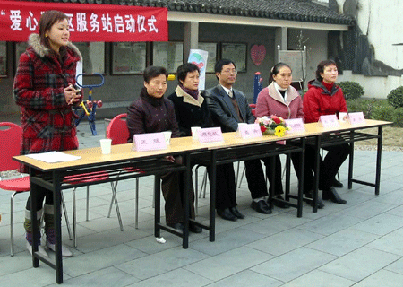 12月15日星期日,杭州戒坛寺巷社区与城市学院工程分院联合成立了“爱心服务站”。在“服务站”成立仪式后,爱心协会会员在社区工作人员的带领下,拜访了社区孤寡老人,向他们分送了“爱心联系卡”,并合影留念。今后,“爱心服务站”将定期上门服务,陪孤寡老人聊天,帮助做家务,教老人使用电脑等等。图为出席“爱心服务站”成立仪式的社区领导和分院领导。